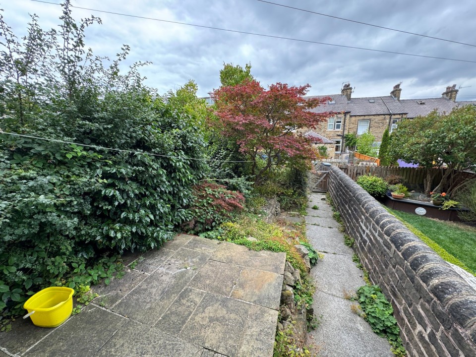 Stone flagged patio area and enclosed garden with mature shrubs at the rear of the property.