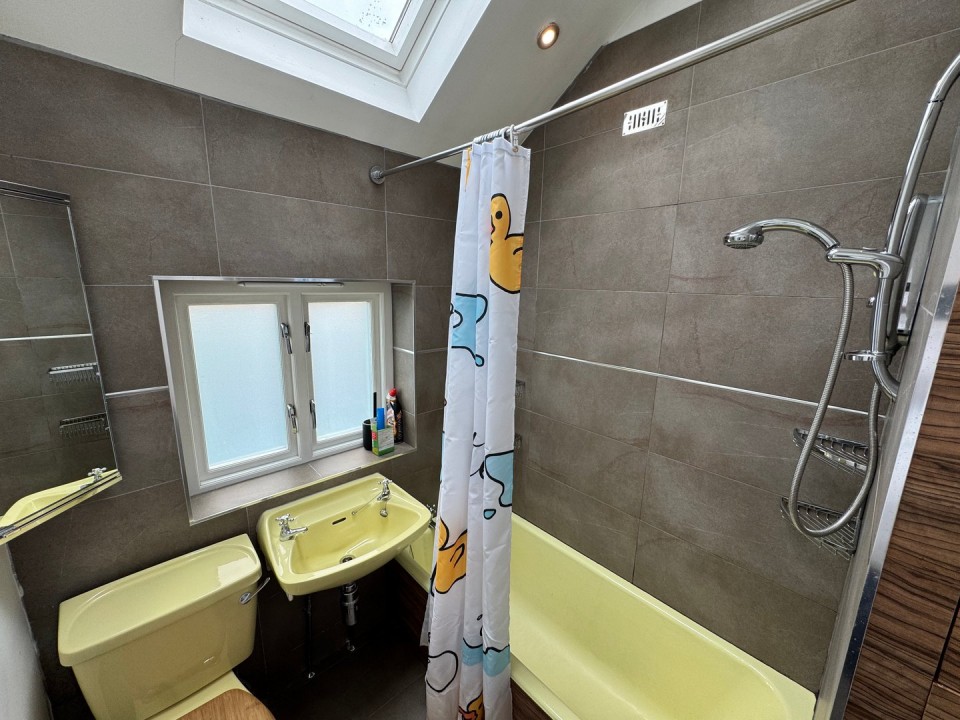 a three piece suite incorporating bath with electric shower over, wall mounted hand basin, low level w.c., large velux window, ceiling spotlights, tiled floor and radiator.