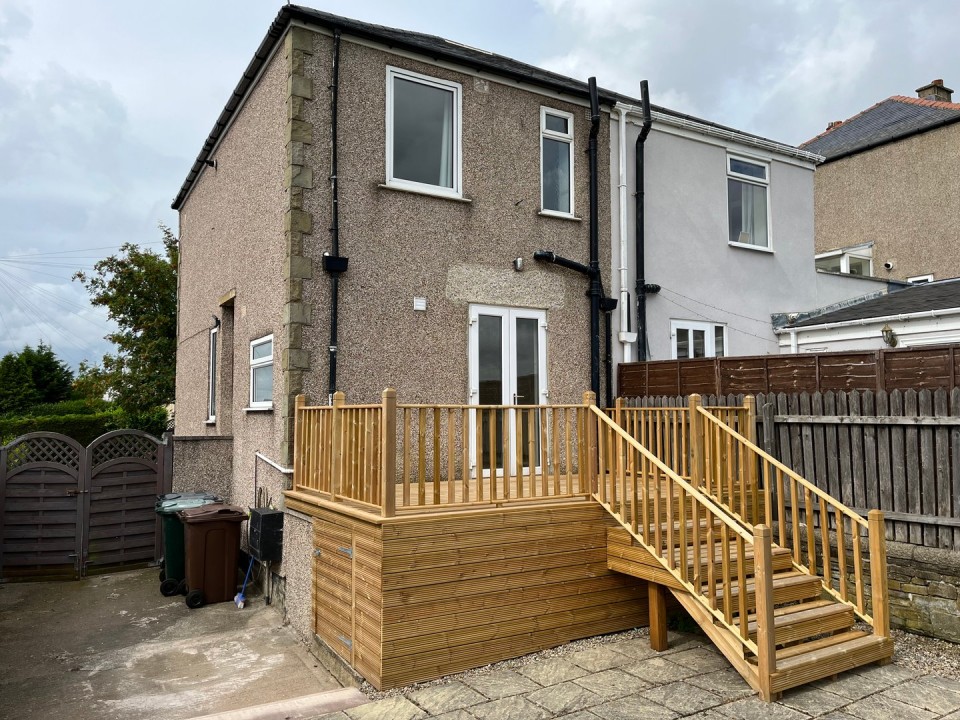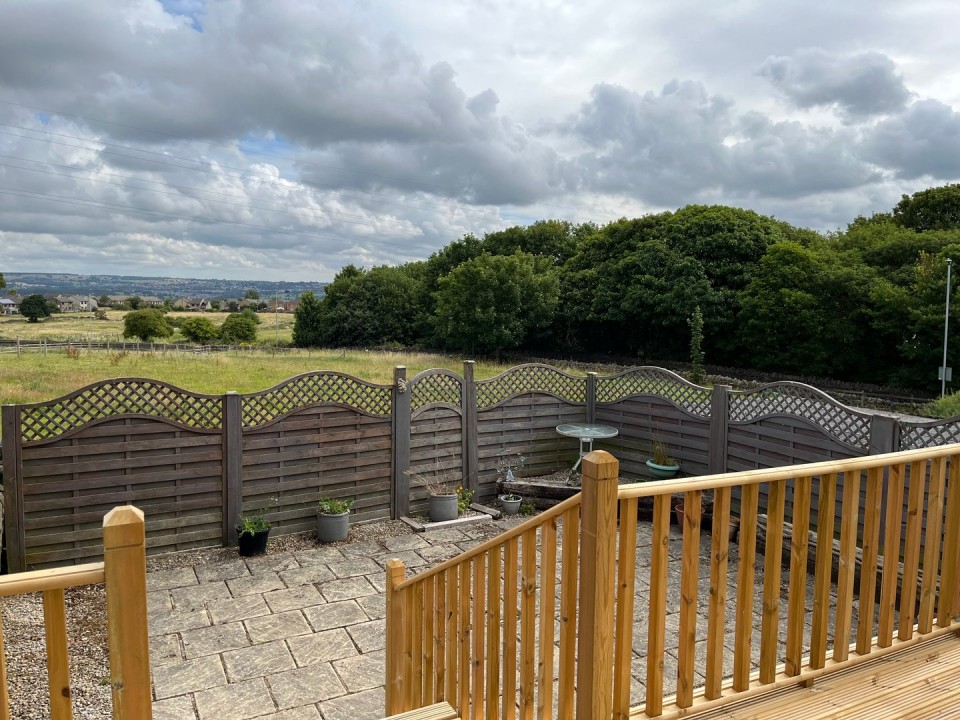 To the front there is a lawned area and driveway. To the rear there is an enclosed stone flagged patio area with raised decking.