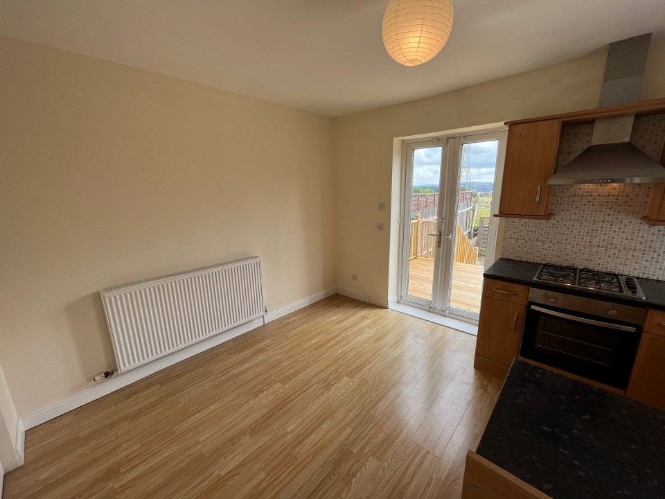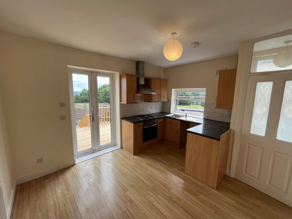 With a range of wood effect base and wall units with black gloss roll edge laminate worktops, built in electric oven, gas hob with extractor above, Stainless steel FRANKE sink with chrome mixer tap over and plumbed for automatic washer. It is part-tiled above the worktops, has light wood effect laminate floor, radiator and patio doors to the rear decking area. Also door to useful understairs storage area.