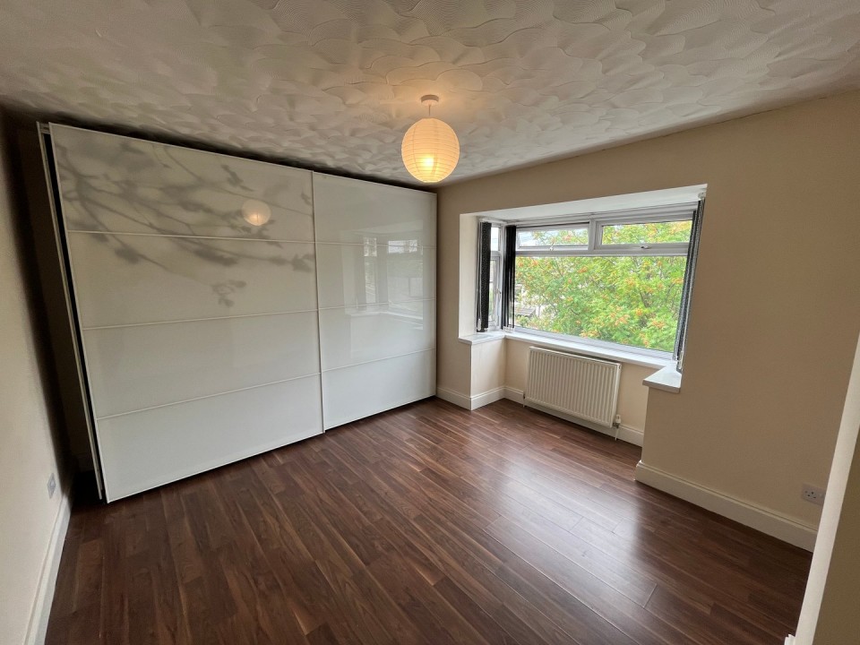 With wood effect laminate floor and radiator. There is a large feature wardrobe with sliding doors, bay window and vertical blinds.