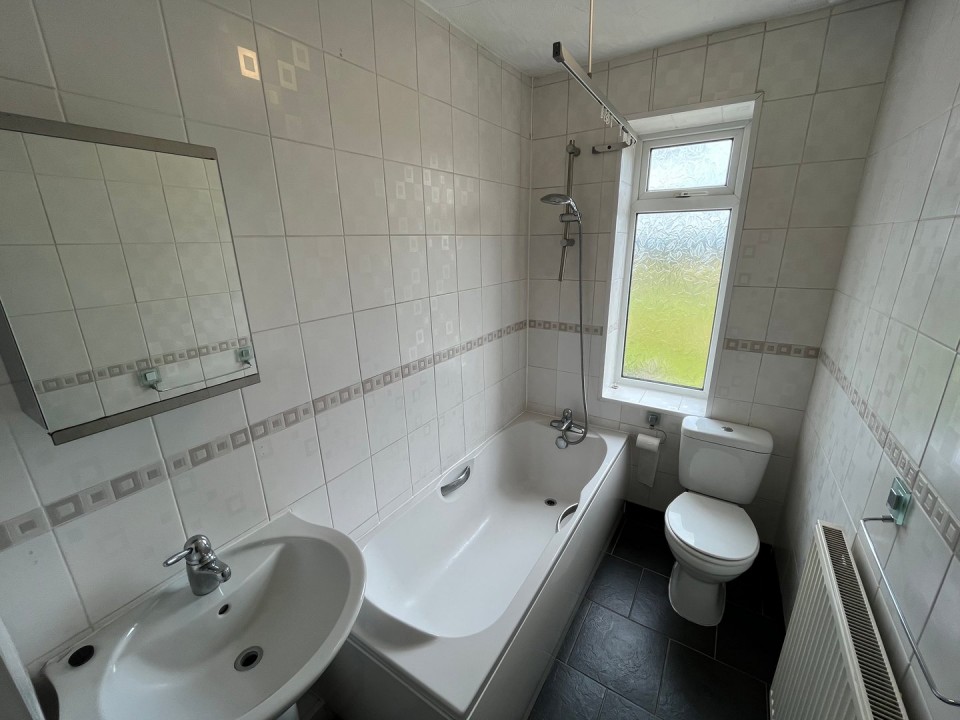 Fully tiled three piece suite with chrome fixings. Bath with mains powered shower over, pedestal wash basin and low level w.c. Dark grey tiled floor and radiator.