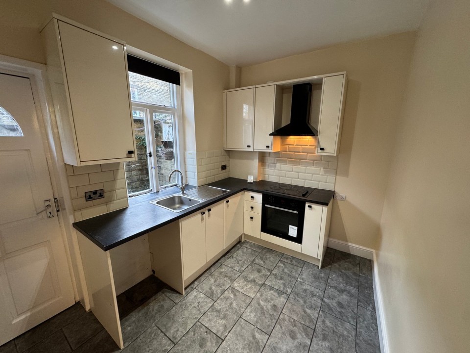 MODERN cream base and wall units, dark grey laminate worktops, inset steel sink and drainer, part tiled with cream 'brick style' tiles. Built in electric oven, ceramic hob with extractor hood over, plumbing for washing machine. Tall feature radiator, tiled floor, IDEAL combination boiler.