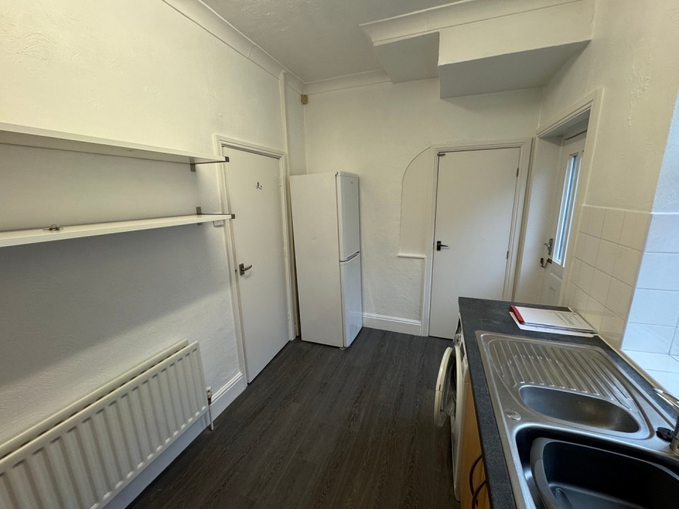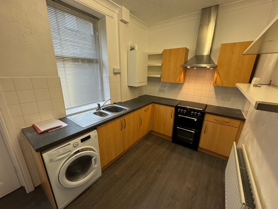 equipped with range of base and wall units, laminate worktops, with stainless steel sink and drainer. "Stoves" dual fuel cooker with stainless steel extractor hood above, plumbing for washing machine, also radiator.