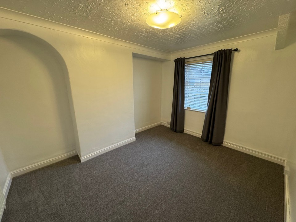 with recessed fireplace, Gas "stove effect" fire, wood mantel, and radiator. Attractive arched "Saltaire pattern" window.
