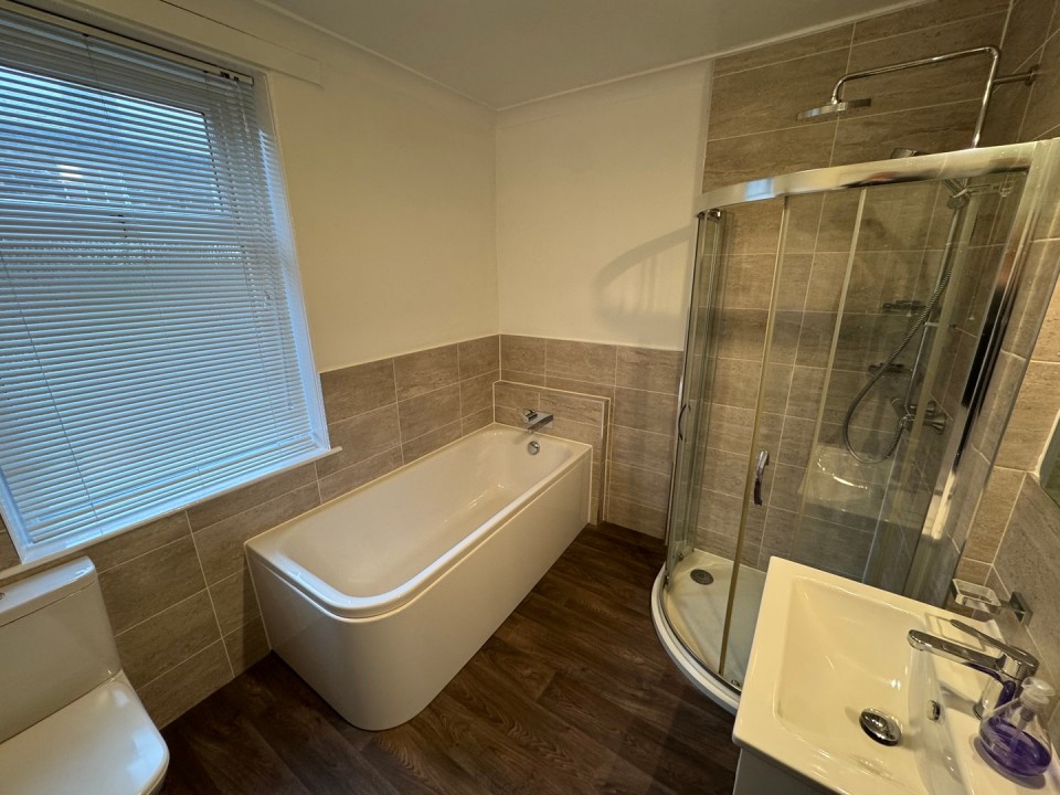 excellent bathroom incorporating large panelled bath, separate corner shower cubicle with mains powered shower, hand basin in vanity unit and low level w.c., large towel radiator, wood effect vinyl floor covering.