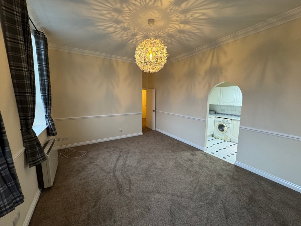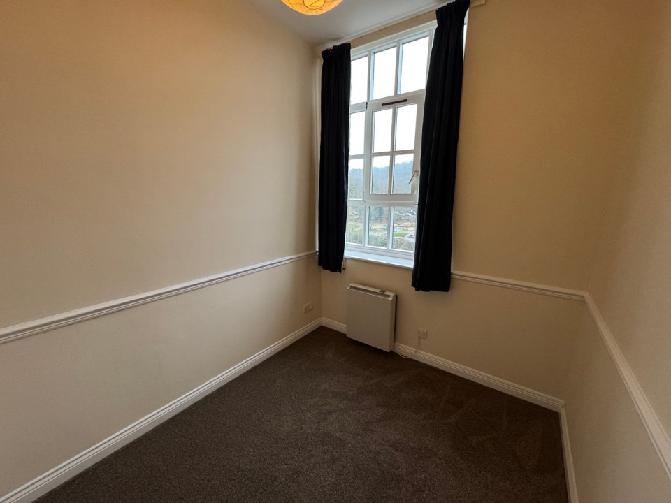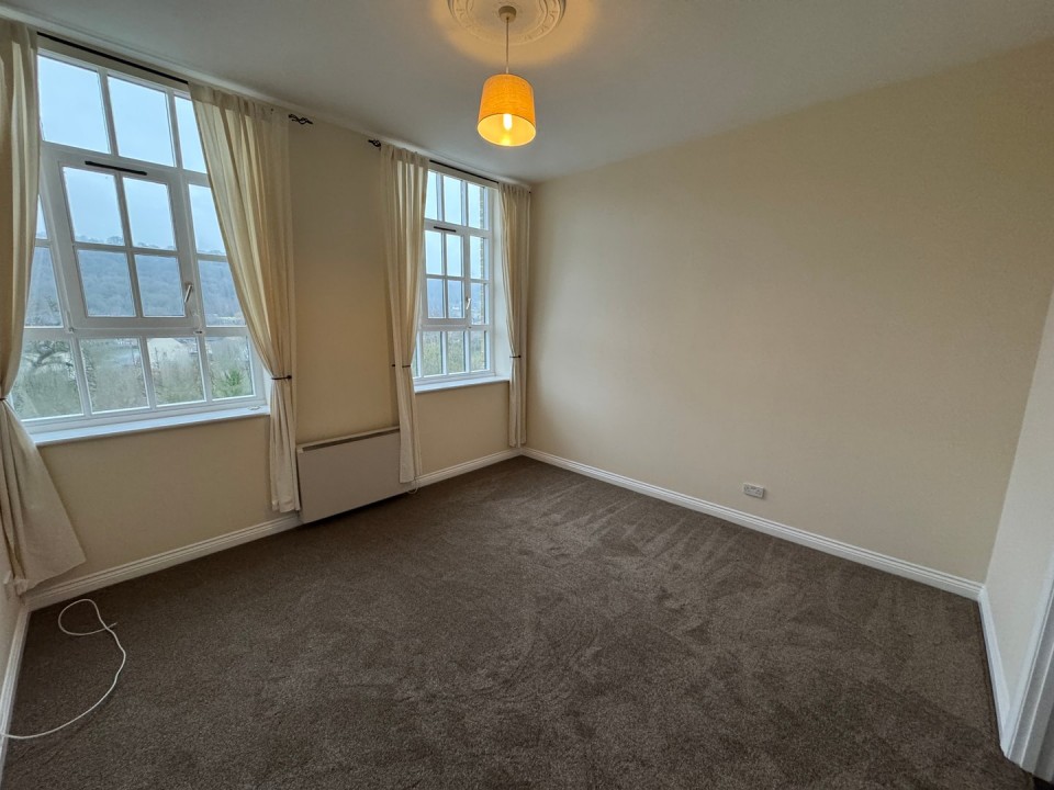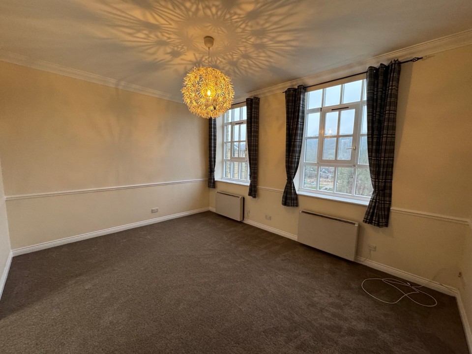 A lovely light living room with high ceiling, two large windows affording views over the River Aire, NEW carpet, two electric wall heaters.