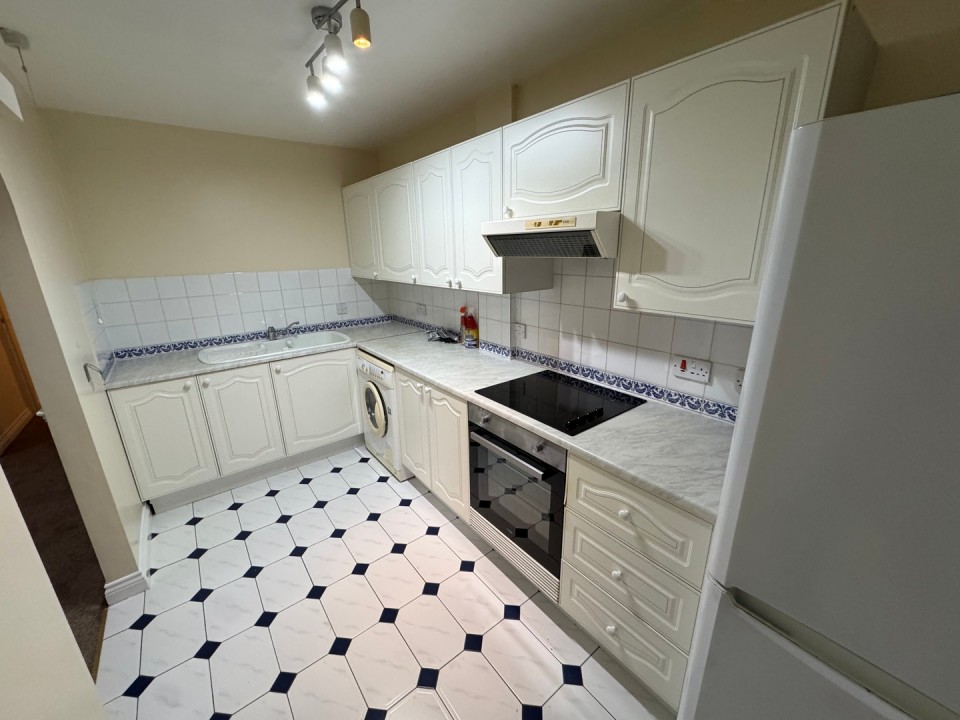 Range of white base and wall units, electric oven and hob with extractor, fridge freezer and washing machine, vinyl floor covering.