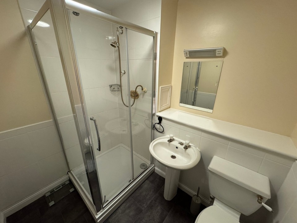 With shower cubicle, white low level w.c. and pedestal wash basin, heated towel rail, vinyl floor covering.