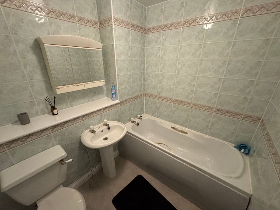 Fully tiled with white three piece suite. Panelled bath, low level w.c. and pedestal wash basin, heated towel rail and vinyl floor covering.