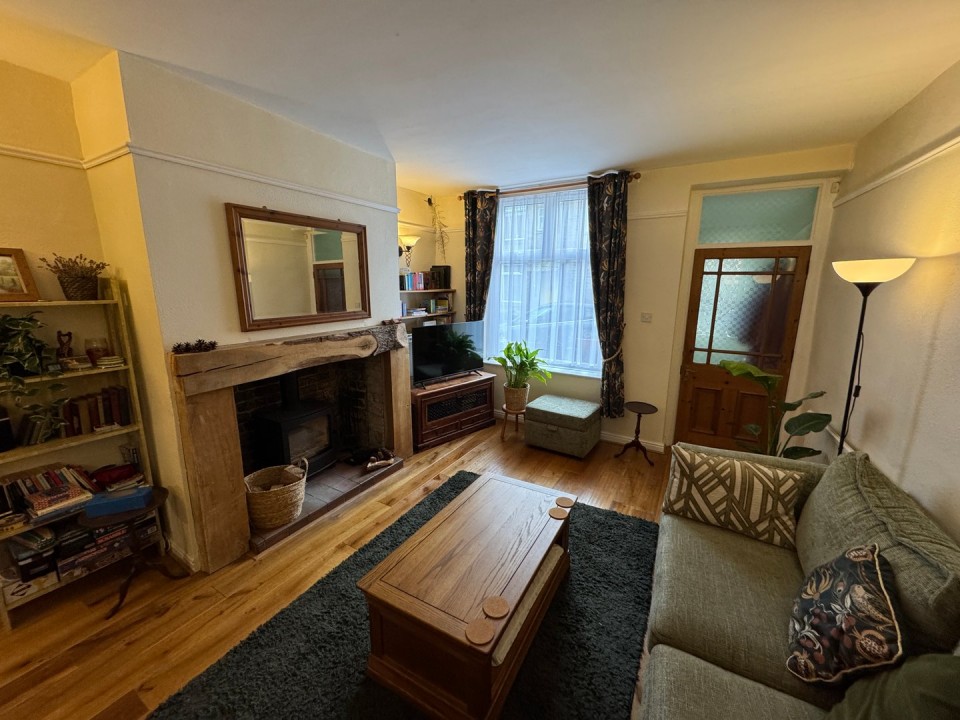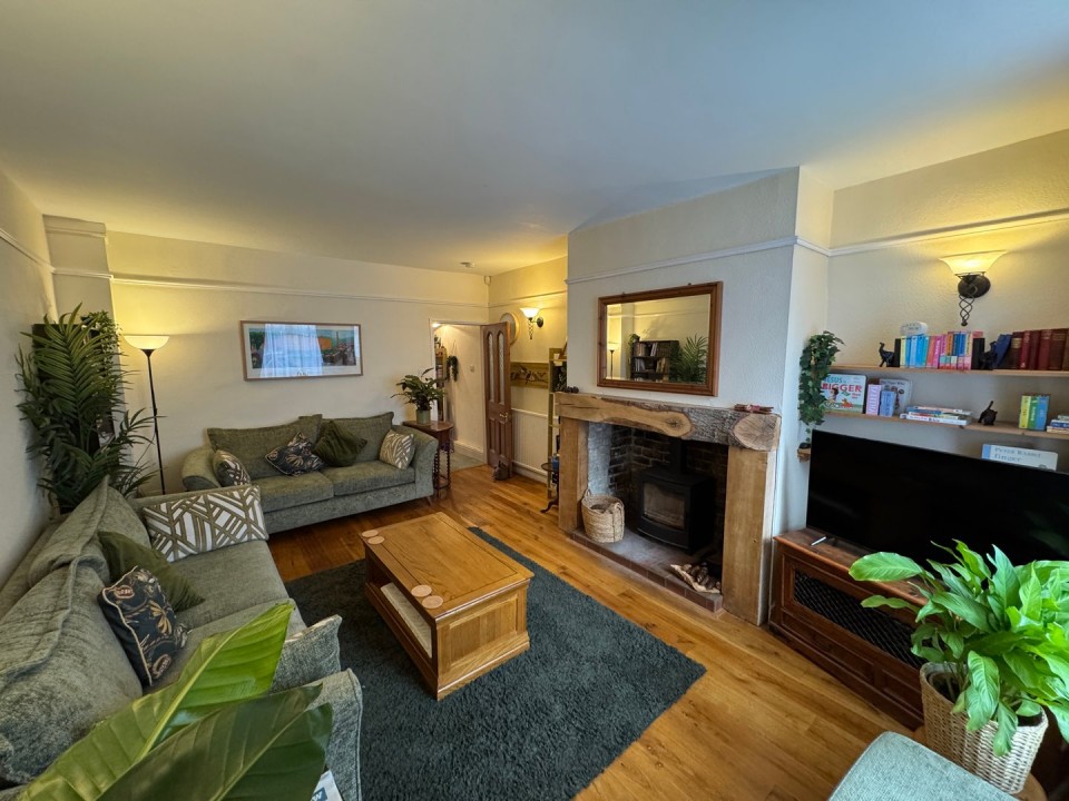 Spacious lounge featuring high wood fire surround and wood burning stove on a tiled recess.
