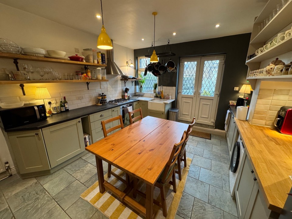Fitted with a range of base and wall units, complementary worktops, inset pot sink. Built-in electric oven, gas hob with extractor above, integral dishwasher and plumbing for washing machine.