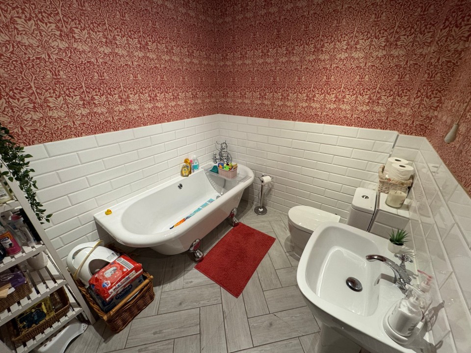 Featuring a roll top bath with mixer tap shower attachment, pedestal handbasin and low level w.c.. Part -tiled and with feature radiator.