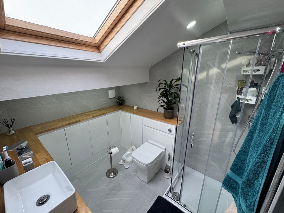 Shower enclosure with mains powered shower, w.c., handbasin and built in storage. Fully tiled, velux window, chrome towel radiator.